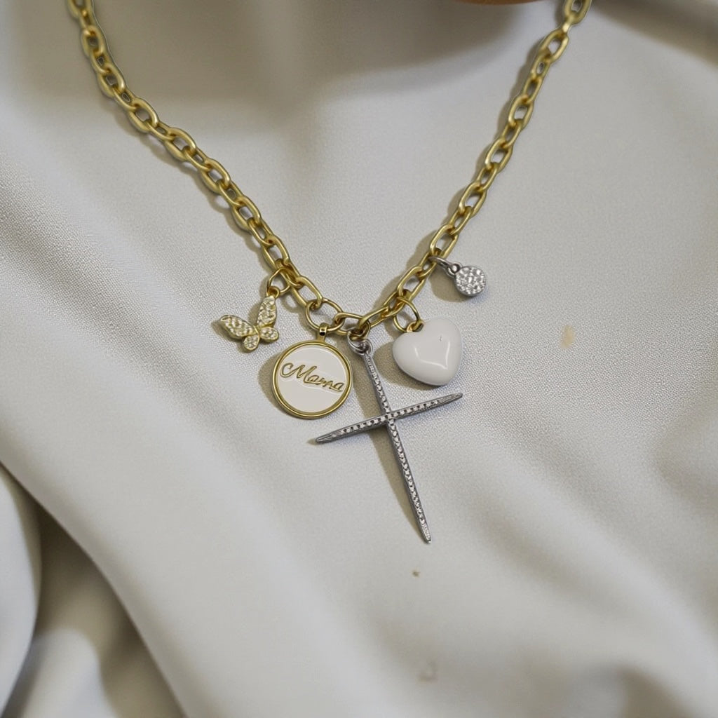 Wear your blessings close. Mixed metal Gold and Silver charms designed on Gold statement paper clip chain. Adorned with a sparkling moissonite pave cross, “Mama” enamel charm, butterfly of new life, white heart, and diamond coin. A beautiful reminder of faith, family, and transformation. 17”-20” adjustable · Hypoallergenic & tarnish-proof.