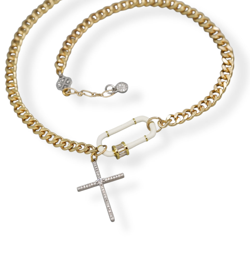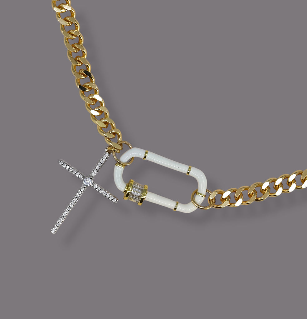 He holds the key. Chunky gold Cuban chain featuring a sparkling pavé cross and white enamel carabiner lock charm — a daily reminder that you are secure in His grip.
